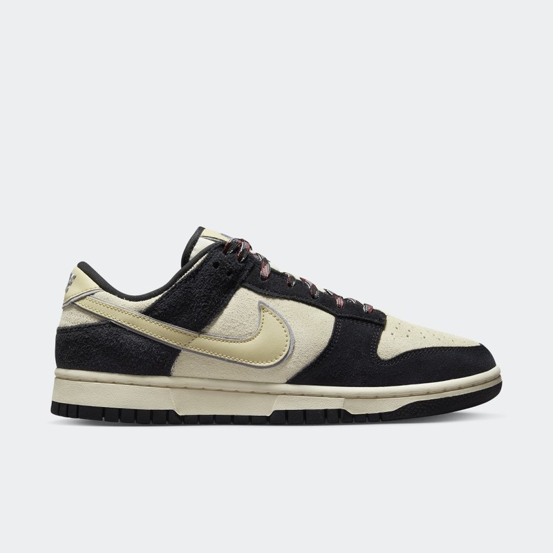 About this product. The Nike Women's Dunk Low LX 'Black Suede' gives a contemporary look to the traditional silhouette by utilizing a suede construction in understated, muted tones. The upper is secured with patterned black and red laces with a base of Coconut Milk, while black overlays and a pale yellow leather Swoosh provide contrasting accents.