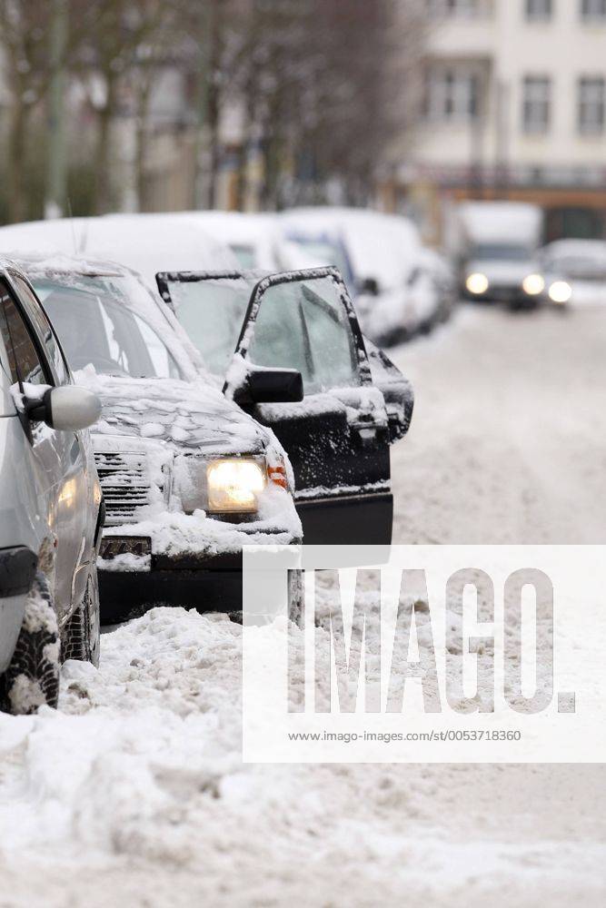 Mann versucht sein Auto frei zu schippen und sich aus der Parklücke ziehen zu lassen auf der