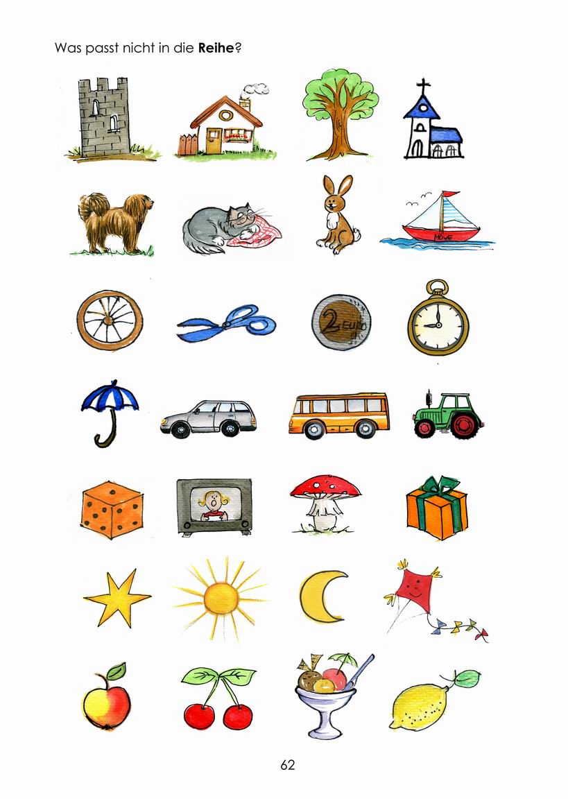 Was passt nicht? from Was fällt aus der Reihe-Rätsel. Great collection of jigsaws and math puzzles, mysterious mazes and labyrinths, intriguing visual logic games, easy handwriting worksheets and spot the difference activities, crosswords for kids, guess the word, rebuses, word search and many other brain teasers.